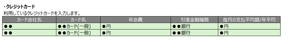 利用しているクレジットカードを入力します。カード会社や年会費なども書いておくと、カードプラン(一般とゴールドなど)の見直しのアドバイスをもらえやすいです。