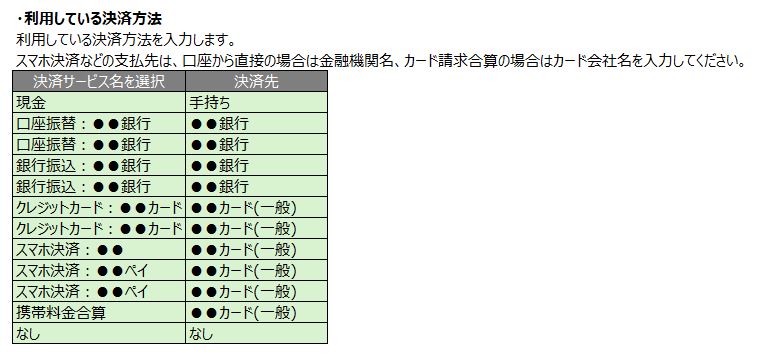 利用している決済方法を入力します。スマホ決済などの支払先は、口座から直接の場合は金融機関名、カード請求合算の場合はカード会社名を入力してください。