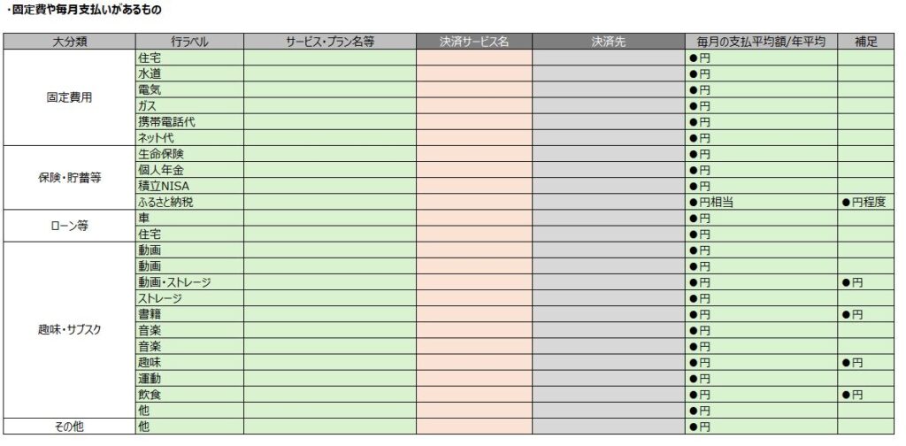 毎月支払っている固定費などをどんな決済方法でいくら支払っているか洗い出します。利用しているサブスク系サービスもこちらにまとめます。