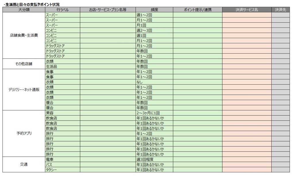 次に、変動費関係の普段の生活で支払っているものを、どこで、どれくらいの頻度で、どのような決済方法で支払っているかをまとめます。普段からポイントを提示して貯めているものがあれば、「ポイント提示/連携」欄に書いておきます。